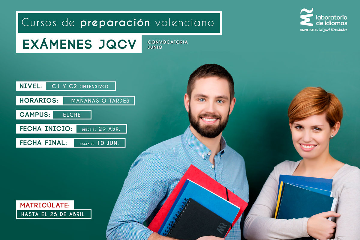 El Laboratorio de Idiomas de la Universidad Miguel Hernández (UMH) de Elche ha puesto en marcha los cursos de preparación para los exámenes de la Junta Qualificadora de Coneixements de Valencià. El objetivo de estas sesiones es que los estudiantes preparen los exámenes oficiales en los niveles C1 y C2. Los cursos se impartirán en el campus de Elche y están abiertos al público en general. Los interesados podrán inscribirse hasta el 25 de abril, a través del enlace www.idiomasumh.es/preparacion-examenes-junta-qualificadora.