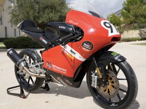 Los estudiantes han realizado un prototipo de moto similar a la que se disputa en el campeonato mundial de Moto3. Este prototipo incorpora un motor KTM con una potencia de unos 45 CV que permitirá a la motocicleta obtener una velocidad superior a los 200 km/h y estiman un peso en seco inferior a 100 kg, gracias a un diseño compacto. El chasis de la moto es tubular, una opción que, según el equipo de la UMH, genera gran rigidez estructural y, a su vez, es económica y sencilla de fabricar. Otra parte importante de la moto es el basculante, fabricado íntegramente de aluminio mecanizado, lo que le proporciona un peso reducido sin comprometer los requerimientos estructurales. El diseño, también, se elaboró con la misma filosofía que el chasis; con un diseño que mantuviera las fortalezas de los anteriores e incorporara mejoras evolutivas a partir de la experiencia en pista. En este proyecto colaboran las empresas Impormotor, Victoriano Maquinaria; Totimport; TurboKit y NG Brakes;