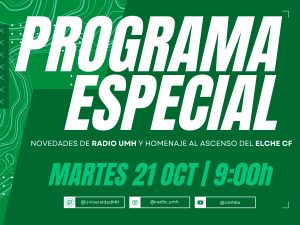 La Radio de la Universidad Miguel Hernández de Elche (UMH) emitirá en directo mañana, martes 21 de octubre, a partir de las 09:00 horas, un programa especial para presentar los nuevos proyectos radiofónicos de su parrilla de programación. Este espacio, que arrancará en el estadio Martínez Valero para homenajear al Elche CF por su reciente ascenso a Primera División y concluirá en el campus de Elche de la UMH, se podrá seguir en línea a través de https://radio.umh.es/la-radio-en-directo/ y del canal institucional de la Universidad Miguel Hernández en YouTube.