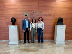 Pie de foto: La profesora Dora Cristina Moreira Martins junto al vicerrector adjunto de Posicionamiento Institucional y Rankings, José Manuel Blanes Martínez, y Beatriz Martín del Río, directora del Máster Universitario en Gestión de Recursos Humanos, Trabajo y Organizaciones durante su visita al Vicerrectorado de Internacionalización y Cooperación de la UMH