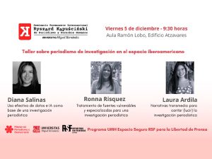 Los profesores de Periodismo de la UMH José Luis González y Carmen López serán los encargados de moderar las intervenciones de las periodistas. En el taller diurno, Diana Salinas hablará sobre sobre data e IA para la investigación periodística, mientras que Ronna Rísquez explicará el tratamiento periodístico de fuentes vulnerables para investigaciones. Por su parte, Laura Ardila intervendrá sobre cuestiones relacionadas con narrativas transmedia para presentar esas investigaciones periodísticas.