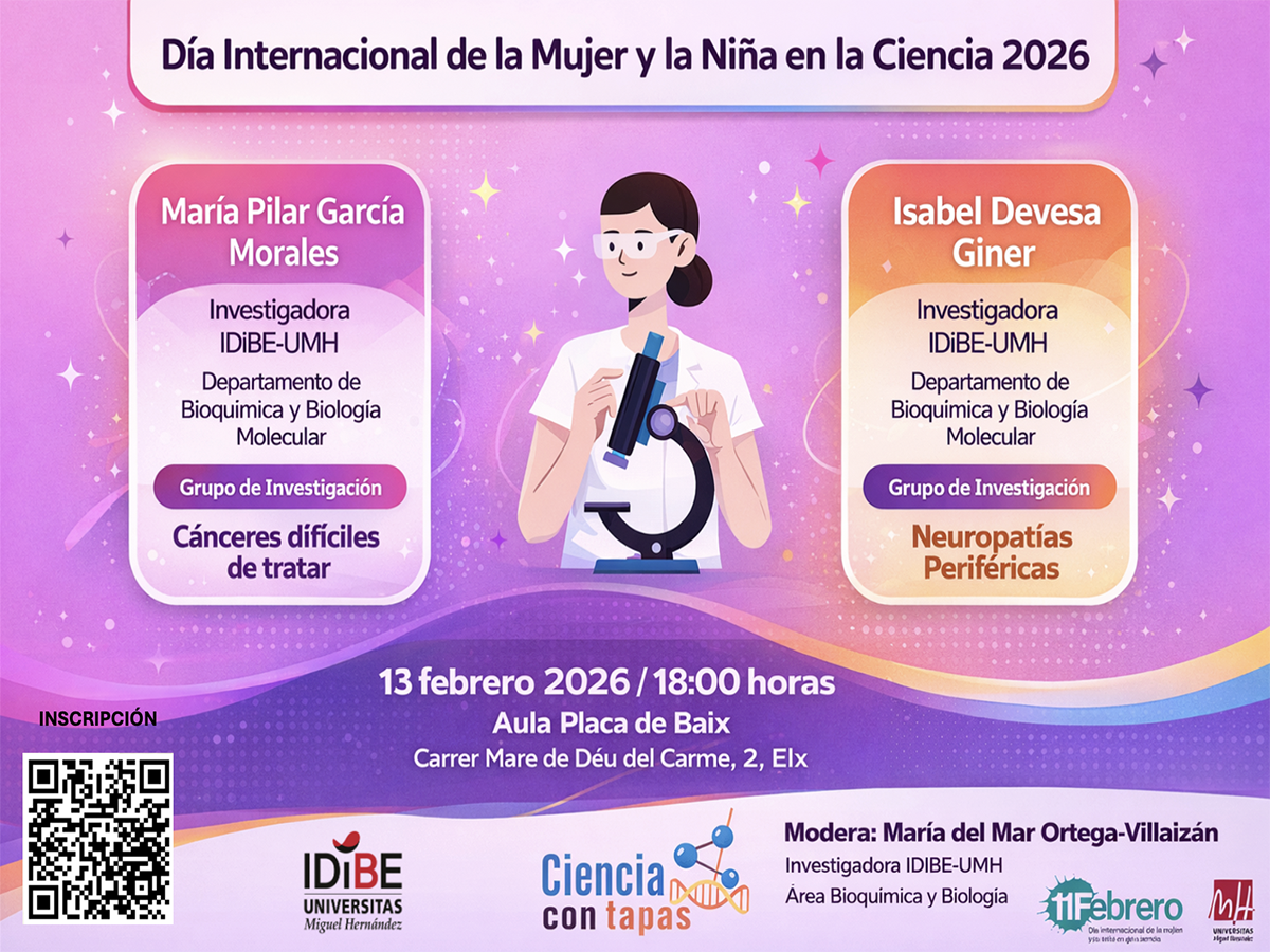 El Instituto de Investigación, Desarrollo e Innovación en Biotecnología Sanitaria de Elche (IDiBE) de la Universidad Miguel Hernández (UMH) ha organizado una nueva jornada de Ciencia con Tapas, con motivo del Día Internacional de la Mujer y la Niña en la Ciencia. El director del IDiBE, Antonio Ferrer, será el encargado de presentar el evento, que se celebrará mañana viernes, 13 de febrero, a las 18:00 horas, en el Aula Plaça de Baix de la UMH.