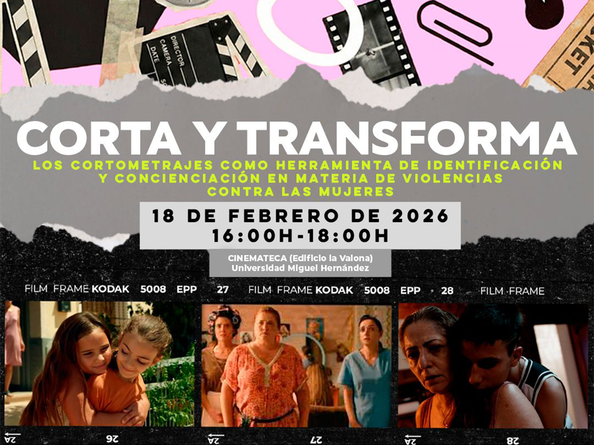 La Universidad Miguel Hernández de Elche (UMH), en colaboración con la Delegación del Gobierno contra la Violencia de Género del Ministerio de Igualdad, ha organizado el taller CORTA y TRANSFORMA: los cortometrajes como herramienta para la identificación de las violencias y la concienciación en materia de igualdad. La actividad está dirigida a estudiantado de la UMH y tendrá lugar mañana miércoles, 18 de febrero, a partir de las 16:00 horas, en la Cinemateca del edificio La Valona del campus de Elche.