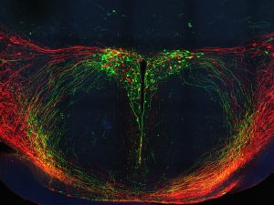 Pie de foto 2: Imagen de microscopía confocal que muestra los circuitos de oxitocina (verde) y vasopresina (rojo) en el hipotálamo del cerebro del ratón, ambos altamente relevantes para la regulación de las conductas sociales en mamíferos. Autora: Mª Pilar Madrigal.