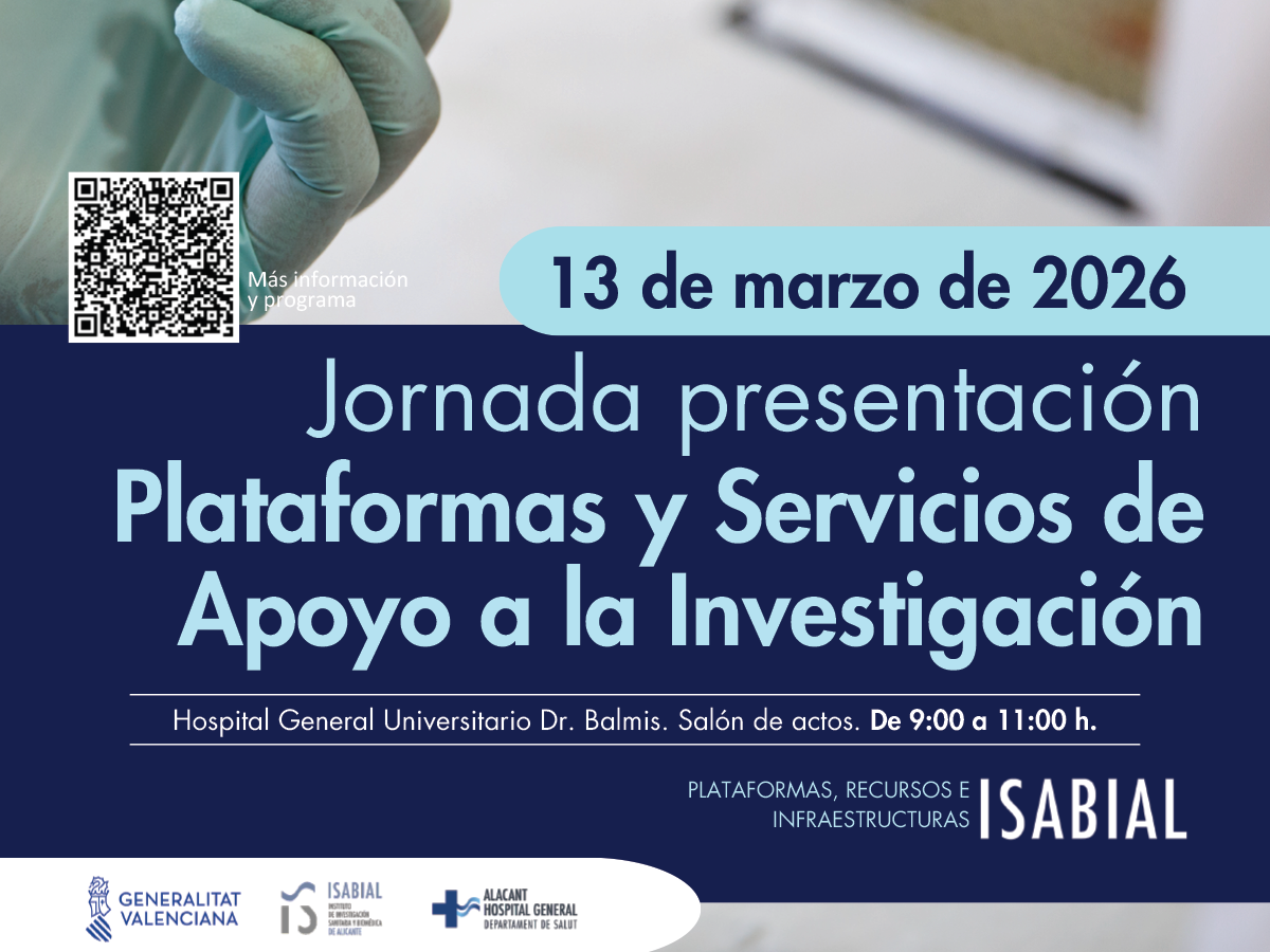 El Instituto de Investigación Sanitaria y Biomédica de Alicante (ISABIAL) ha organizado una jornada de presentación de sus Plataformas de Servicios de Apoyo a la Investigación, en la que colabora la Universidad Miguel Hernández de Elche (UMH). El evento tendrá lugar mañana viernes, 13 de marzo, a partir de las 09:30 horas, en el Salón de Actos del Hospital General Universitario Doctor Balmis de Alicante, así como en streaming.