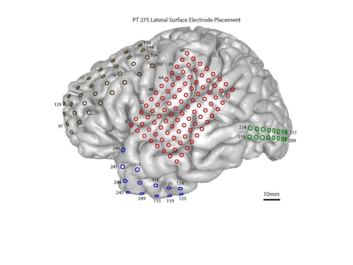 Pie de fotos: Distribución de los electrodos implantados en el cerebro de uno de los pacientes participantes en el estudio. Estos sensores permiten registrar directamente la actividad eléctrica cerebral. El análisis mostró que, tras una sesión de ejercicio físico, aumentan unas señales neuronales de alta frecuencia llamadas ripples, originadas en el hipocampo y coordinadas con distintas regiones de la corteza cerebral implicadas en la memoria.