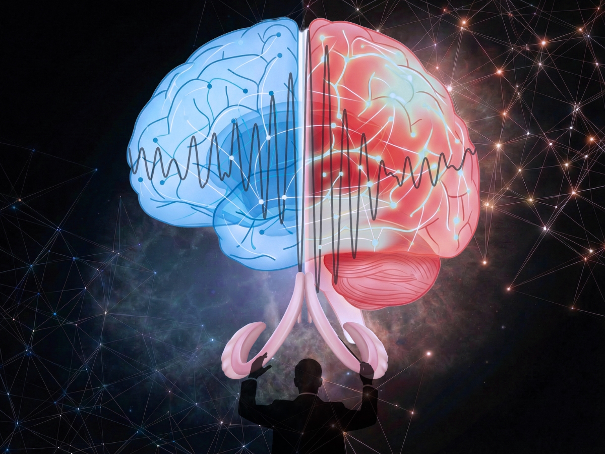 La imagen ilustra el cerebro humano con énfasis en el hipocampo, resaltando los efectos del ejercicio aeróbico sobre la actividad eléctrica hipocampo-cortical durante las oscilaciones de alta frecuencia conocidas como ondas rápidas (ripples). El conductor representa la coordinación y la sintonización de las ondas rápidas hipocampales con las ondas rápidas en las áreas corticales. El acoplamiento hipocampo-cortical es más fuerte durante el reposo posterior al ejercicio (rojo) en comparación con el reposo previo al ejercicio (azul), principalmente en las redes corticales límbicas y de modo predeterminado, lo que demuestra cómo el ejercicio físico puede mejorar la comunicación cerebral a gran escala fuera de línea entre áreas relevantes para el aprendizaje y la memoria.