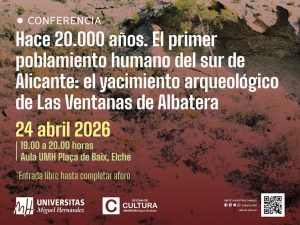 El Aula Plaça de Baix de la Universidad Miguel Hernández de Elche (UMH) acogerá mañana viernes, 24 de abril, a las 19:00 horas, la presentación del audiovisual Hace 20.000 años. El primer poblamiento humano de Albatera. Esta pieza audiovisual, patrocinada por el Ayuntamiento de Albatera, ofrece los resultados de un proyecto de investigación sobre el primer poblamiento humano en el sur de la provincia de Alicante y para el que los resultados obtenidos en Albatera hacen de este municipio un referente para el estudio de la prehistoria en el sur de Alicante. La entrada es libre limitada al aforo de la sala.