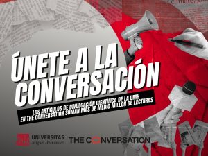 The Conversation és una plataforma global que permet a acadèmics i acadèmiques explicar el seu treball en un llenguatge accessible i basat en evidència i els continguts de la qual són reproduïts per periòdics i revistes com CNN, BBC, El País, Le Monde o The Washington Post. Aquest model fa accessible la investigació universitària i facilita que arribe a audiències no especialitzades de tot el món. Els articles aportats pel personal de la UMH en el 2025 s’han republicat en mitjans d’Espanya, França, els Estats Units, Mèxic, l’Argentina i Veneçuela, entre altres.